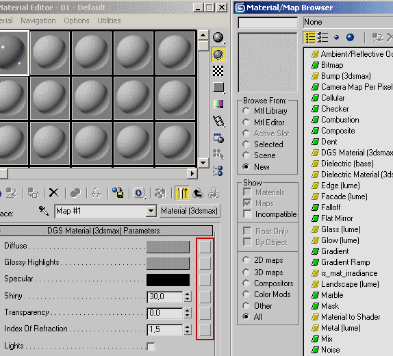 Таким образом, если работать со стандартными материалами 3ds max, о привязке освещении можно не беспокоиться - она может быть выполнена стандартными средствами max. Но если в материале используются стандартные шейдера mental ray, может возникнуть ситуация, когда придется редактировать списки источников в материалах.