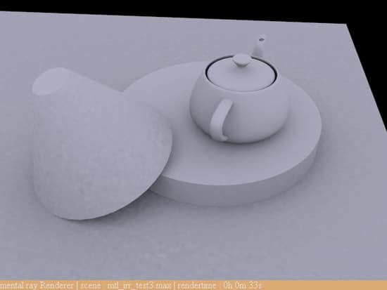 Теперь для чайника и цилиндрической подставки назначим новый материал, подключив IllumLambert через is_mat_irradiance с настройками FG : 150 сэмплов, min radius = 0.1 см, max. Radius = 1 см.