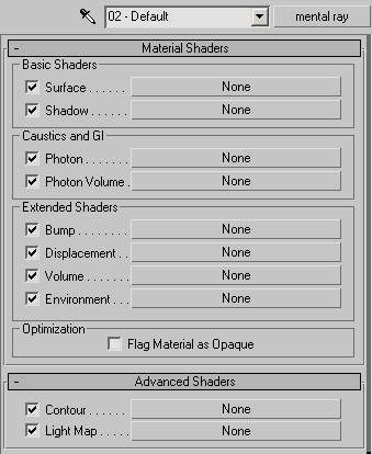 Примечание. Поскольку 3ds max использует собственную схему указания источников света для объектов, параметры light и mode скрыты. Если работа ведется только с light шейдерами 3ds max, эти параметры не понадобятся. Если же потребуется работать с исходными light-шейдерами mental ray, скорее всего, их придется открыть.