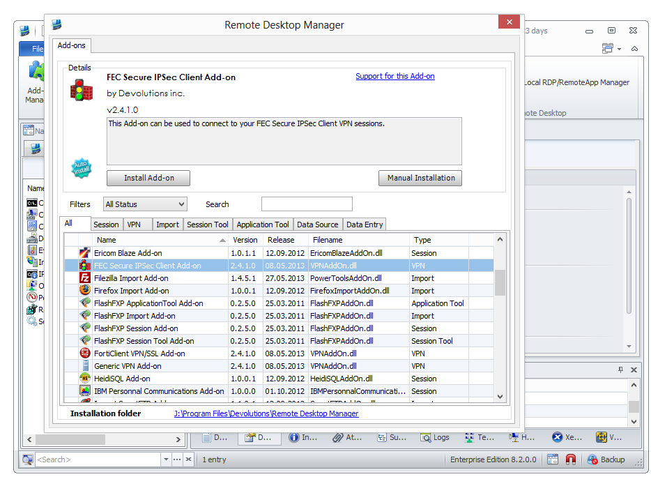 Впрочем, никто не отменял передачу файлов через SSH или FTP. Для расширения функциональности, RDM предлагает более 60 модулей. Дополнительные инструменты подключаются через менеджер Commands — Tools — Add-on Manager (для удобства они сгруппированы по тематикам: импорт, VPN, сессия и др.).