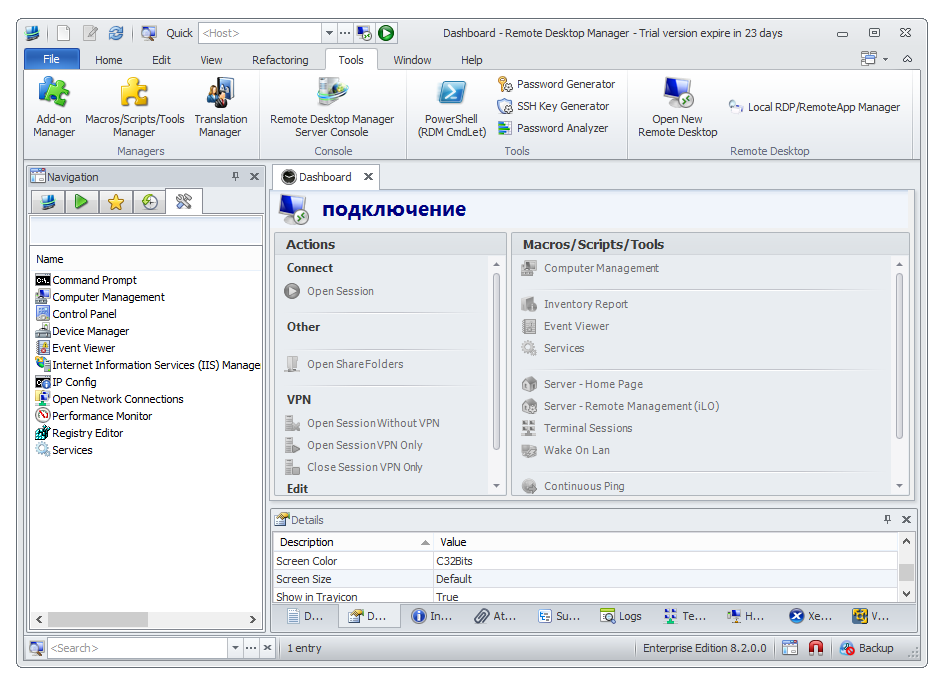 Remote Desktop Manager, с первого же взгляда, производит впечатление «универсала», объединившего в себе множество протоколов: RDP, SSH, Web, VNC, Telnet, ICA/HDX, TeamViewer, LogMeIn, FTP, нескольких типов VPS-соединений и мн. др. Централизация (термин, часто применяемый в описании RDM) относится и к другим аспектам — например, программа подходит для хранения конфиденциальной информации и других важных данных. Далее внимание будет обращено непосредственно на возможности удаленного контроля.