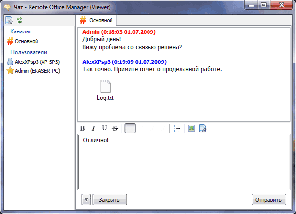 Режим передачи файлов не менее важен. Возможность работать с файлами удаленного компьютера, как с данными находящимися в локальной системе, реализует отдельный модуль Remote Office Manager.