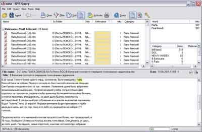 Найденные документы программа выводит в результирующем списке согласно релевантности - соответствия документа тексту запроса. В различных технологиях, конечно, присутствуют различные методы поиска и определения релевантности документа (количество "вхождений" слова и его частота упоминания в документе, соотношение этих параметров к общему количеству слов в документе, расстояние между словами фразы запроса в искомых файлах и так далее). На основе этих параметров определяется "вес" документа и, в зависимости от него тот или иной файл оказывается в списке результатов на определенной позиции. В случае с Интернет-поиском дело обстоит еще сложнее. Ведь в данном случае надо учитывать и множество иных факторов (Page Rank Google тому пример). Но это тема для отдельной статьи, поэтому Интернет трогать не будем.