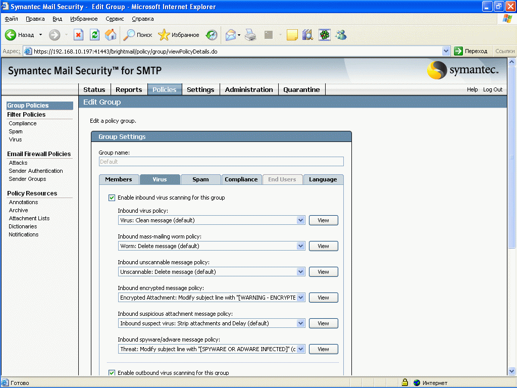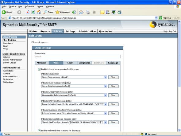 Рисунок 12: Policies – Group Policies – Virus – Настройка правил обработки вирусных инцидентов для входящей и исходящей почты, набор правил можно определять самостоятельно (см. Рисунок 21-22)