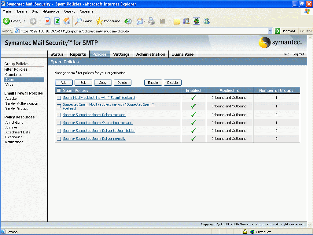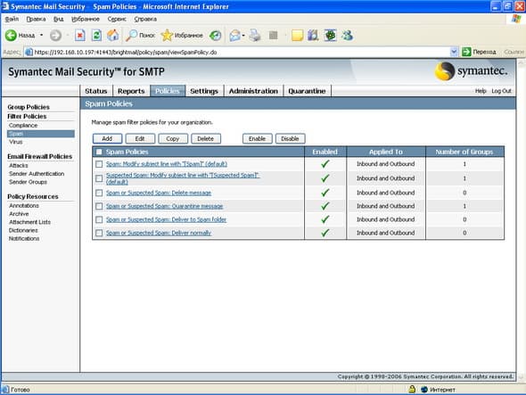 - Определение Suspected Spammers (составляющая Symantec Sender Reputation Service) (Email Firewall)