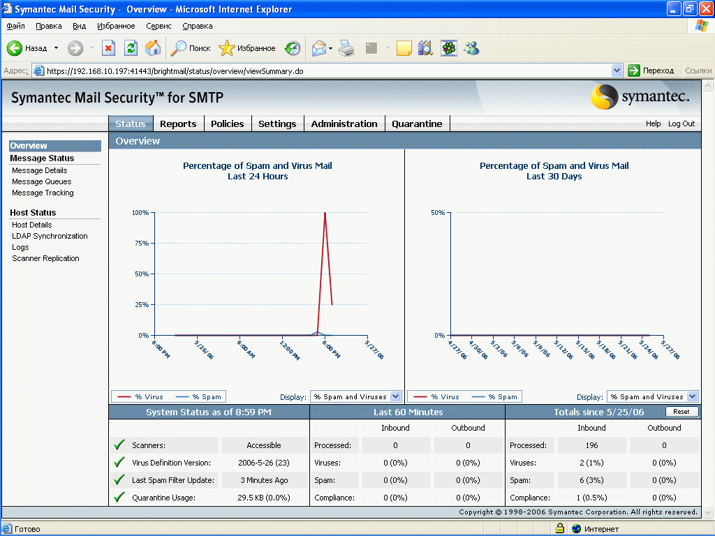 Рисунок 2: Status – Overview – Графическое и табличное представление состояния системы: информация о вирусных и спам инцидентах, состояние карантина и сведения об обновлениях