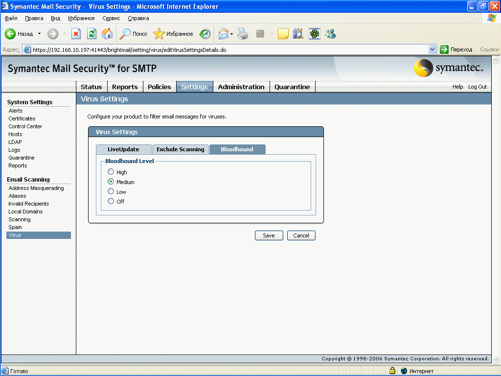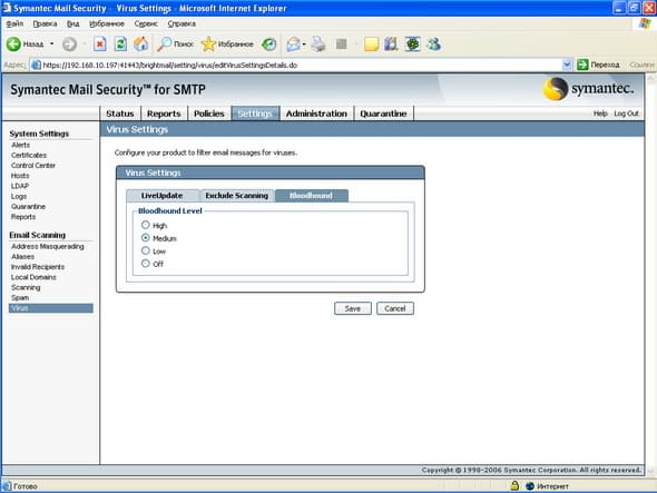 Рисунок 57d: Settings – System Settings – Email Scanning – Virus – BloodHound – Настройка чувствительности эвристичекой технологии сканирования