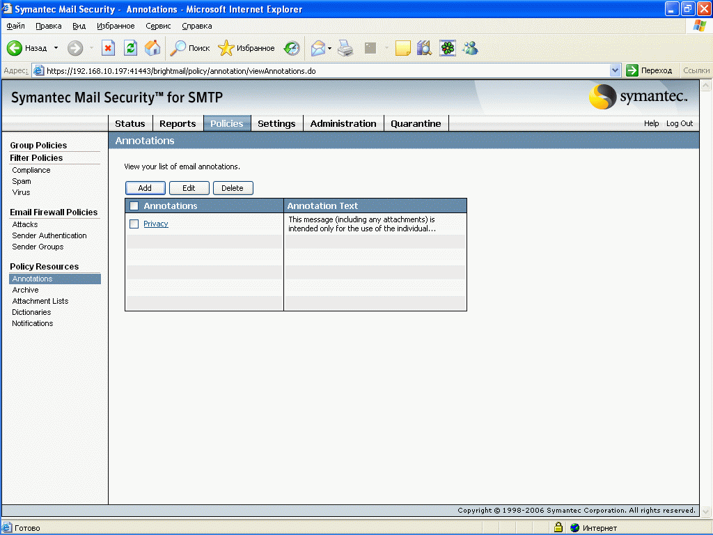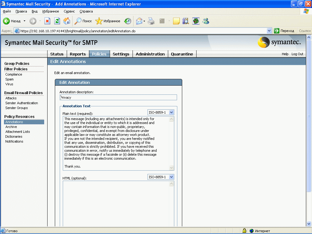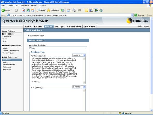 Рисунок 27: Policies – Policy Resources – Annotations – Создание и редактирование аннотаций, которые возможно добавлять в текст письма при выполнении определенных условий (доступен как Actions во всех фильтрах)