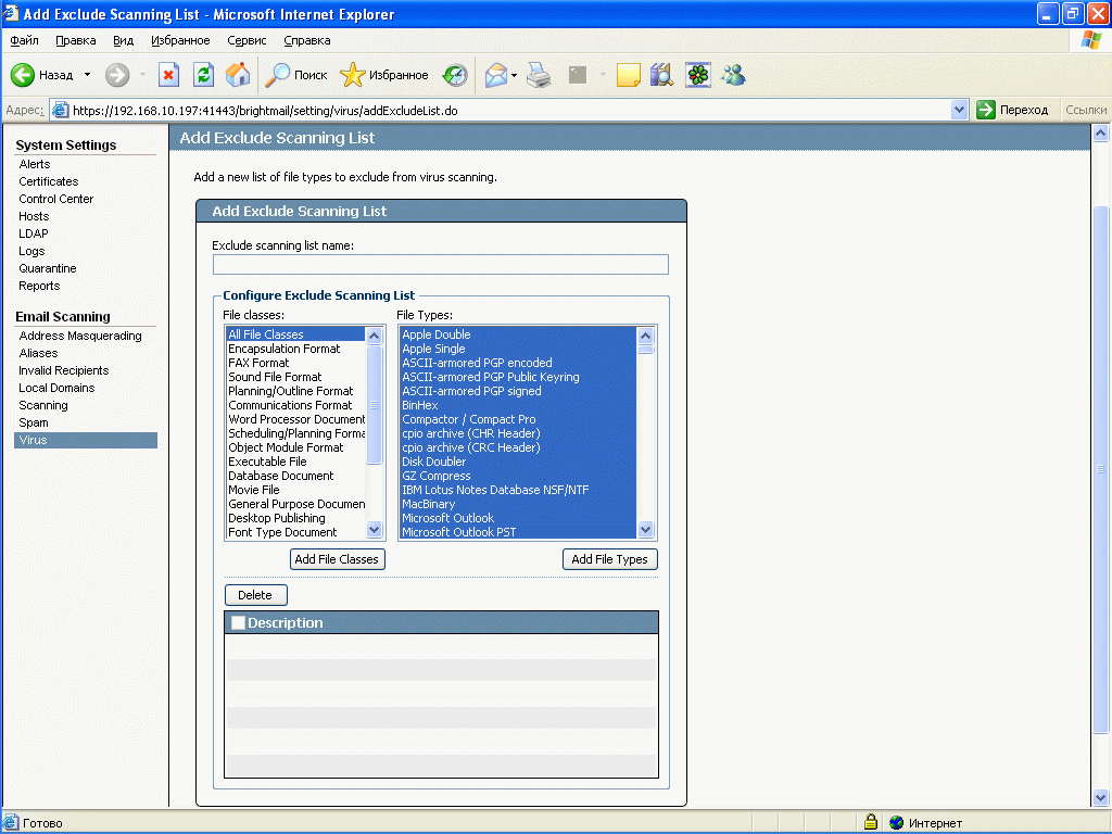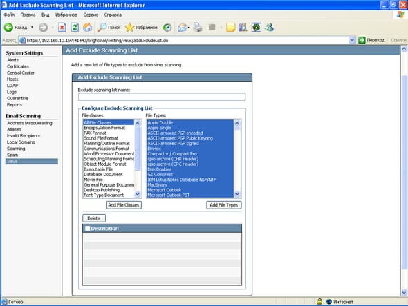 Рисунок 57c: Settings – System Settings – Email Scanning – Virus – Exclude Scanning – Пример создания списка исключений, поддерживается добавление типов и классов файлов