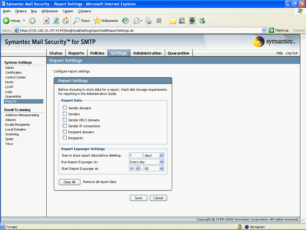 Рисунок 50: Settings – System Settings – Reports – Настройка параметров сохранения информации работы MTA для детализации отчетов