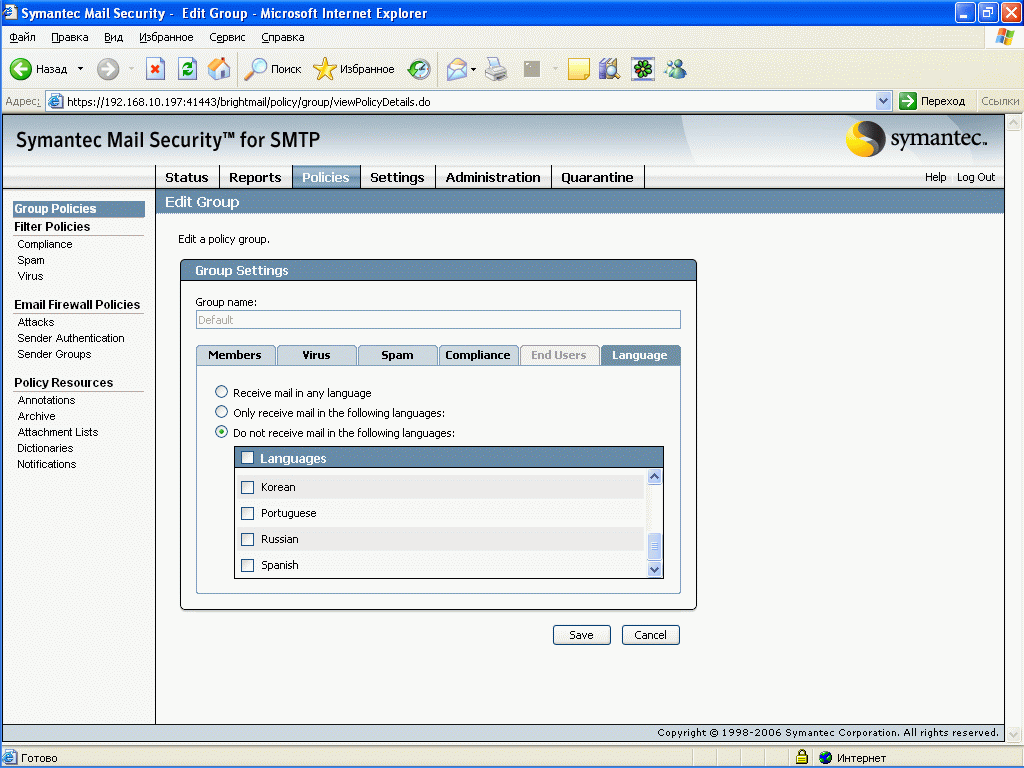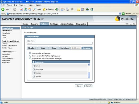 Рисунок 15: Policies – Group Policies – Language – Настройка правил языковой идентификации, позволяющих удалять письма в кодировках, которые не разрешены в системе, в том числе поддерживается русский язык