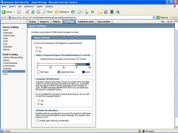 Рисунок 56: Settings – System Settings – Email Scanning – Spam – Настройка критериев идентификации спама