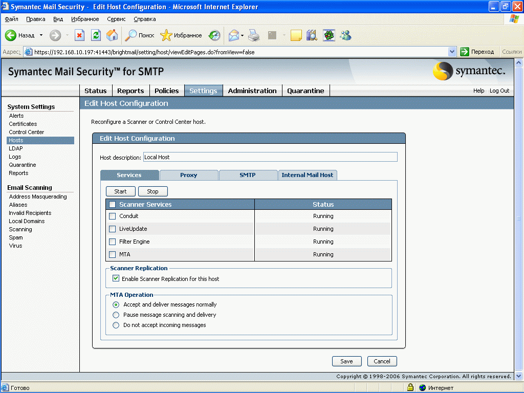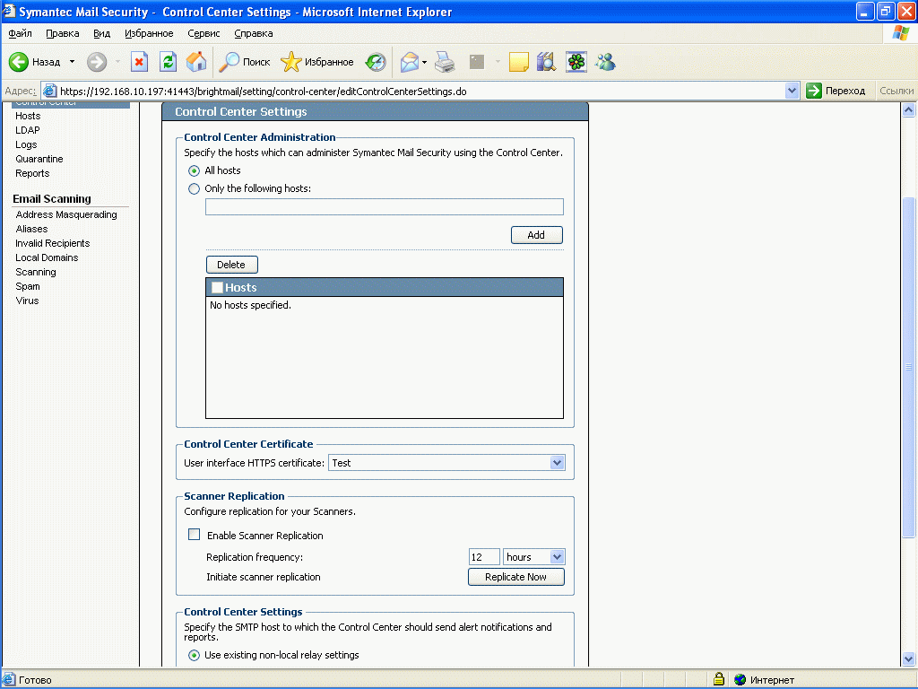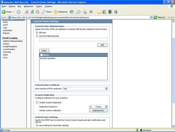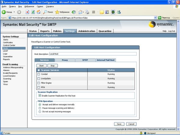 Установка проводилась на виртуальную машину с ОС Windows 2003 Server Standard с 512 Мб ОЗУ, сам процесс установки прост и интуитивно понятен. Продукт состоит из нескольких компонент, установка которых возможна на разные хосты (См. Рисунок 63): сканеры отдельно, Центр Управления вместе с карантином отдельно, соответственно неограниченное число сканеров может быть поключено к одному Центру Управления. Тестирование проводилось на сымитированном потоке писем, который отсылался с помощью почтового клиента на SMTP соединение виртуальной машины, поэтому говорить о качестве срабатывания по спаму сложно, с вирусами проблем не было, не было также проблем с образцами контентной фильтрации (в том числе русский язык) и языковой идентификацией.Графический материал: