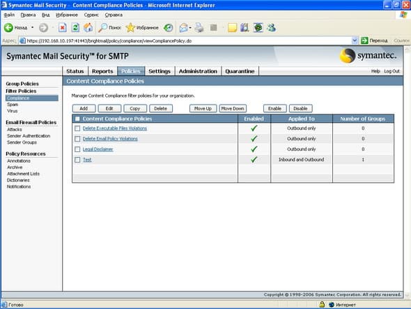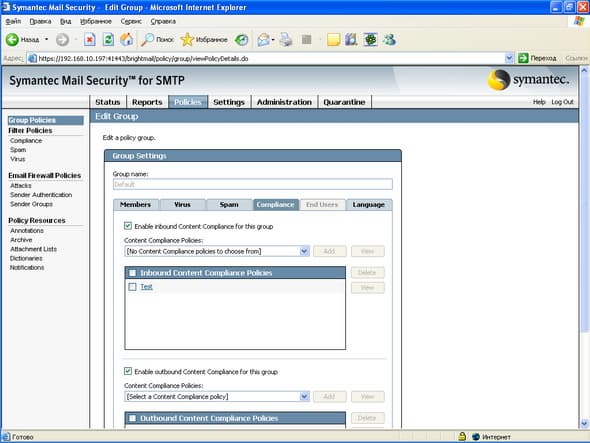 Рисунок 14: Policies – Group Policies – Compliance – Настройка правил контетной фильтрации для входящей и исходящей почты, набор правил можно определять самостоятельно (см. Рисунок 16-18)