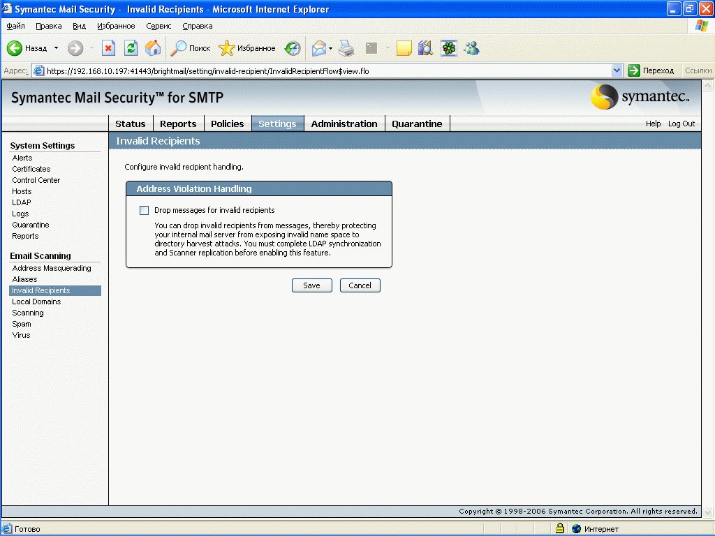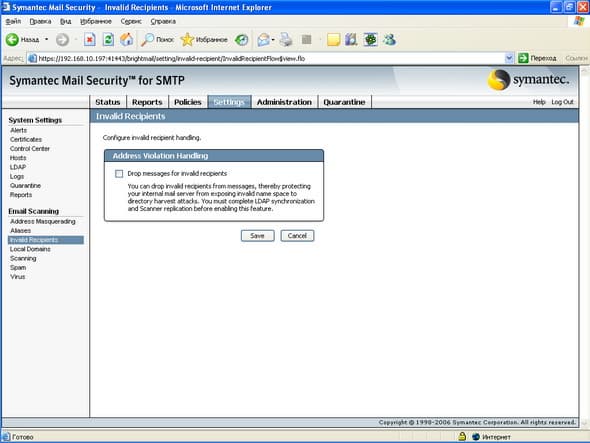 Рисунок 53: Settings – System Settings – Email Scanning – Invalid Recipients – Активизация функции удаления из писем несуществующих получателей (требуется наличие сервера синхронизации LDAP)