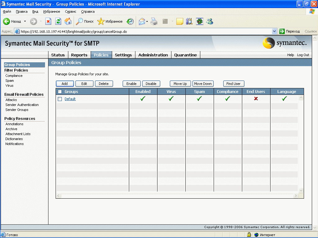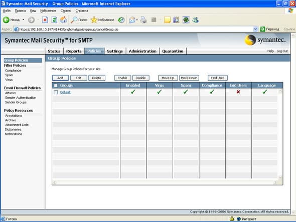 Рисунок 10: Policies – Group Policies – Список групповых политик, по которым обрабатываются все сообщения в системе, возможно создание, приоритезация, активизация политик, а также поиск пользователей, по какой политике обрабатываются для него (них) сообщения