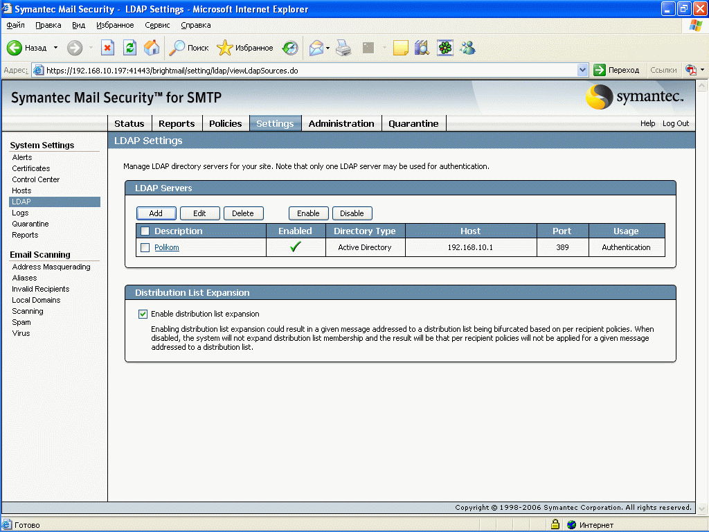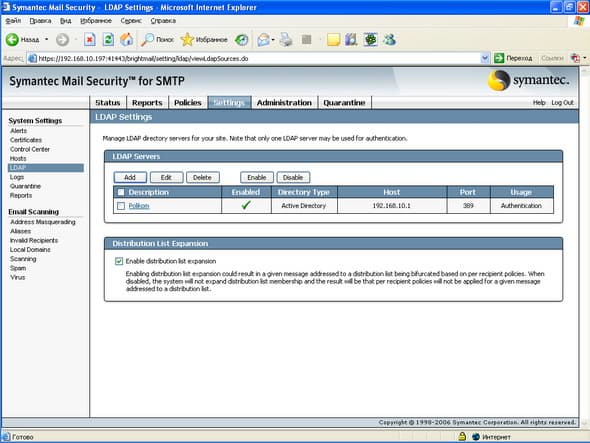 Рисунок 45: Settings – System Settings – LDAP – Добавление, редактирование и активизация LDAP подключений двух типов: для синхронизации (используется для передачи списков адресов на сканеры для проверки адресов при приеме почты) и для аутентификации (используется для доступа к спам карантину)