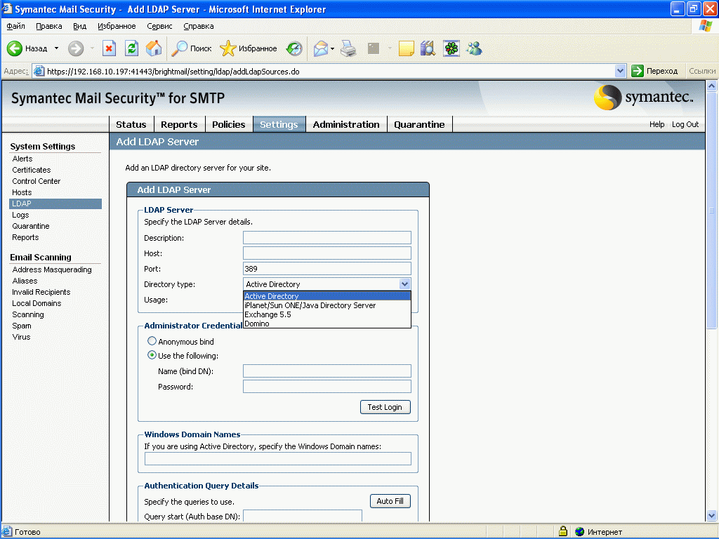 - Windows 2000 Active Directory или Windows 2003 Active Directory или Sun Directory Server 5.2 или Exchange 5.5 или Lotus Domino LDAP Server 6.5 или OpenLDAP (только для аутентификации)