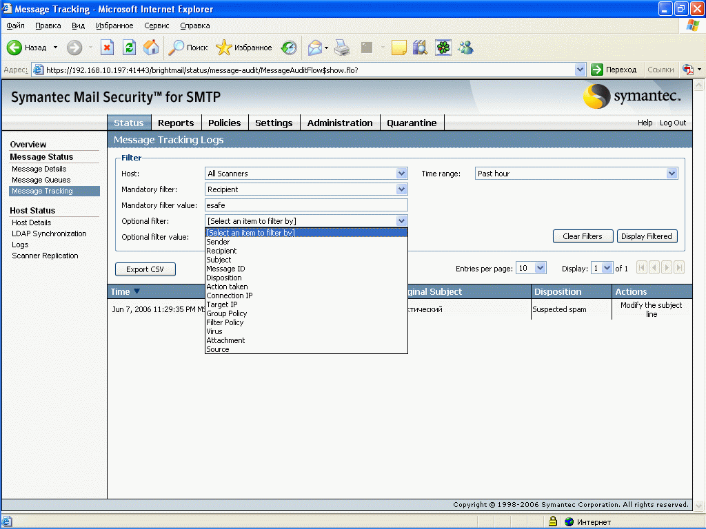 Рисунок 58: Quarantine – Spam Quarantine – Просмотр общего спам карантина с возможностью поиска и отбора