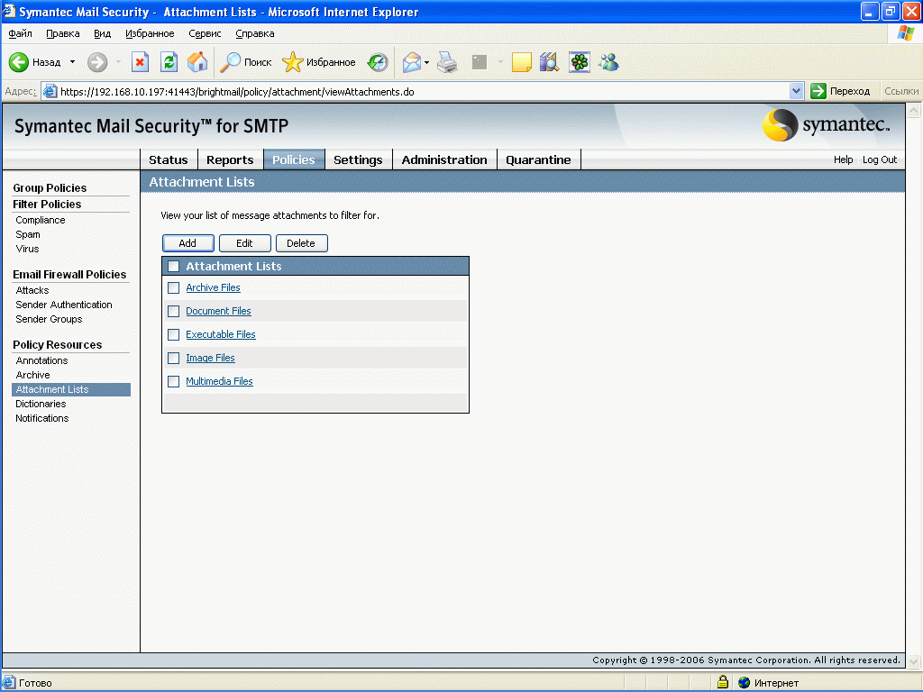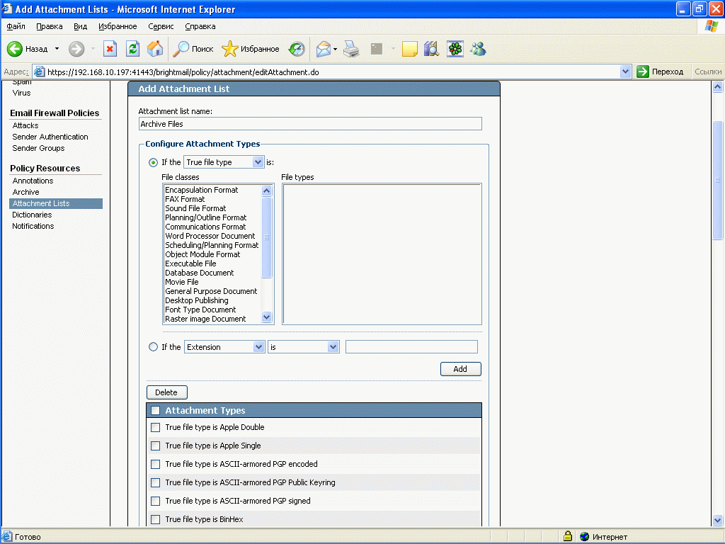 Рисунок 30: Policies – Policy Resources – Attachment Lists – Создание и редактирование списка наборов вложений по типам и классам, применяемых для определения правил контентной фильтрации