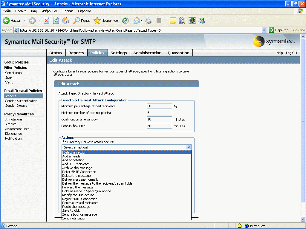 Рисунок 24a: Policies – Email Firewall Policies – Attacks – Directory Harvest Attack – Варианты действий над сообщениями и критерии Directory Harvest Attack