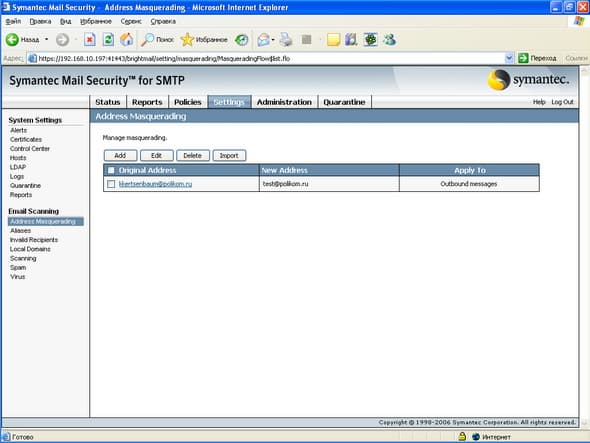 Рисунок 51: Settings – System Settings – Email Scanning – Address Masquerading – Настройка возможности маскировки адресов во входящих и исходящих сообщениях