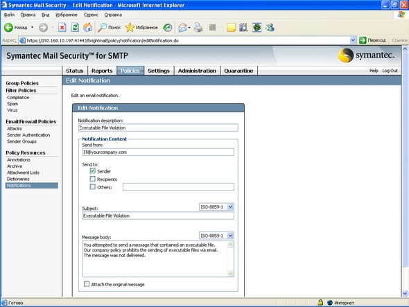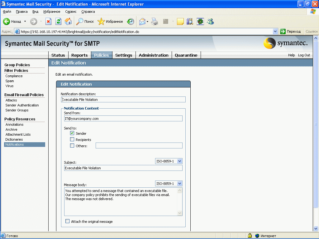 Рисунок 34: Policies – Policy Resources – Notifications – Пример создания информационного письма