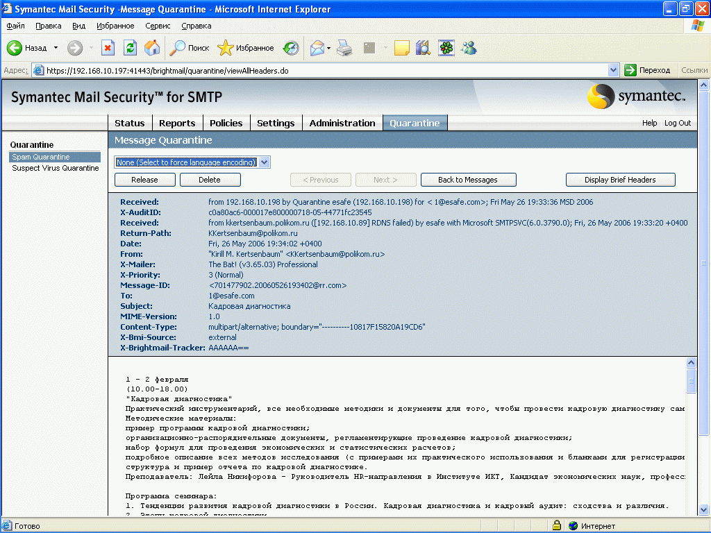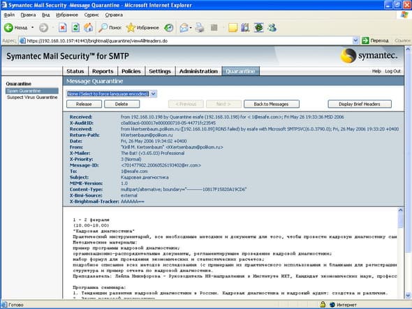 Рисунок 59: Quarantine – Spam Quarantine – Просмотр примера сообщения в карантине