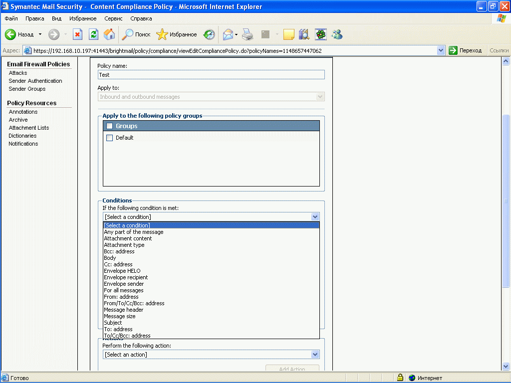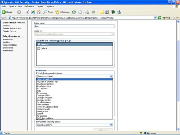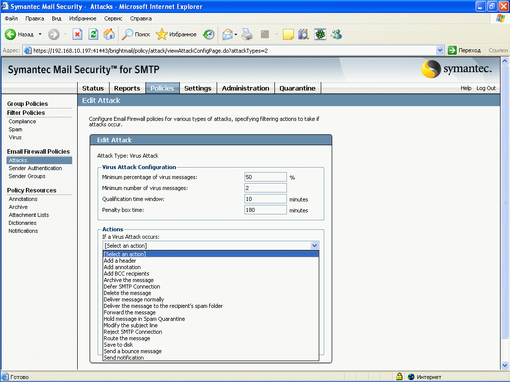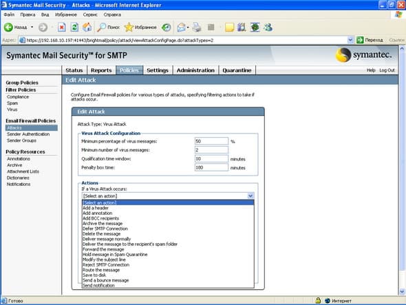 Рисунок 24c: Policies – Email Firewall Policies – Attacks – Virus Attack – Варианты действий над сообщениями и критерии Virus Attack