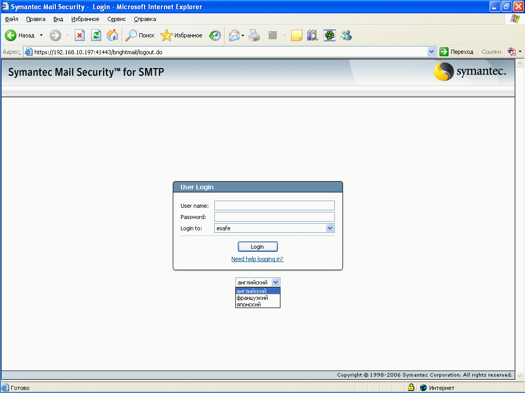 Рисунок 1: Login page – Стартовая страница консоли управления для администраторов системы, а также консоли индивидуальных настроек и спам карантина для конечных пользователей (при условии интеграции с LDAP)