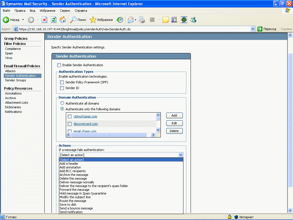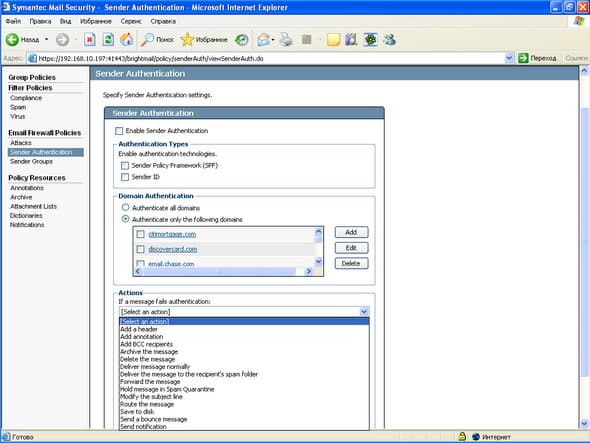 Рисунок 25: Policies – Email Firewall Policies – Sender Authentication – Активизация и настройка двух типов аутентификации отправителей: Sender ID и Sender Policy Framework (SPF)