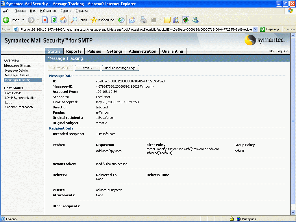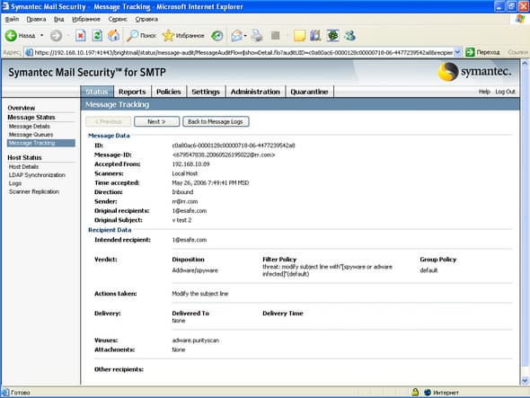 Рисунок 7:Status – Message Status – Message Tracking – Details – После нахождения интересующего сообщения возможен просмотр подробной информации по нему, включая информацию о произведенных действиях и обнаруженных инцидентах