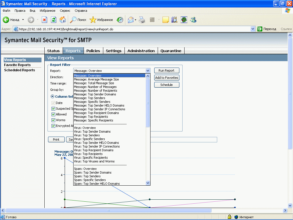 Рисунок 9: Reports – View Reports – Система содержит в себе подробнейшую систему отчетов, большинство из них видны в выпадающем списке, уровень детализации зависит от настроек (см. Рисунок 49), возможно создание Favorite Reports (индивидуальны для каждого администратора системы с соответствующими правами), и создание отчетов по расписанию, возможно сохранение в html и csv
