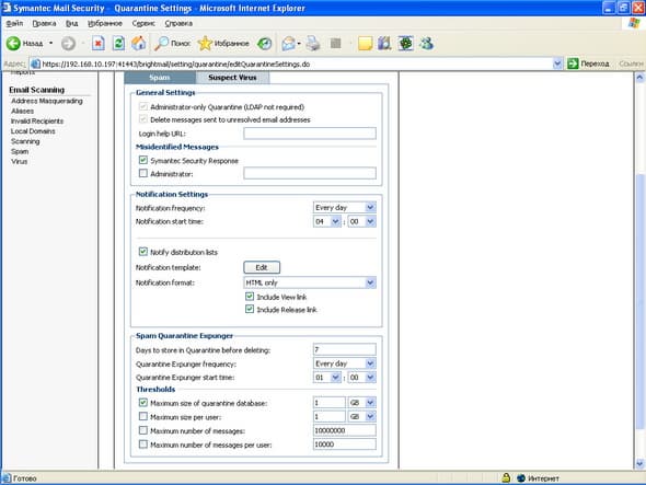 Рисунок 49: Settings – System Settings – Quarantine – Virus – Настройка параметров карантина для подозрительных сообщений (при срабатывании эвристического механизма BloodHound), настройка периода времени, через которое сообщение должно быть пересканировано для уточнения инцидента