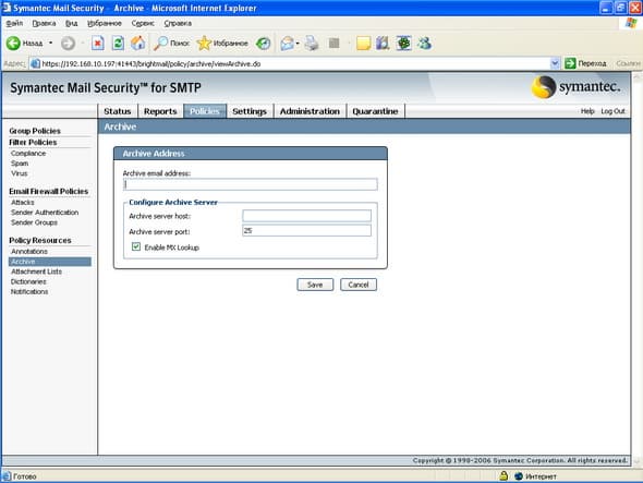 Рисунок 29: Policies – Policy Resources – Archive – Настройка возможности пересылки копии всего потока сообщений на удаленный ресурс