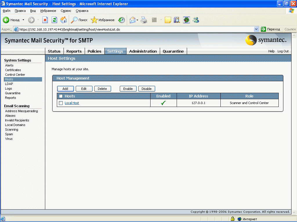 Рисунок 40: Settings – System Settings – Hosts – Добавление, редактирование и активизация сканеров
