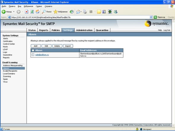 Рисунок 52: Settings – System Settings – Email Scanning – Aliases – Настройка почтовых групп для входящих сообщений