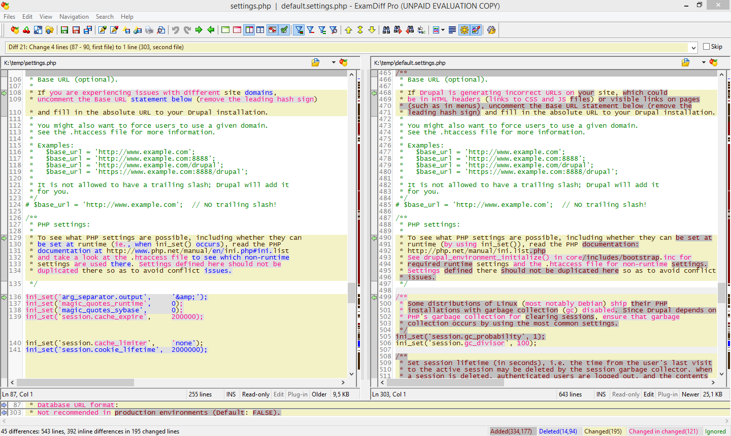 Программа ExamDiff предназначена для визуального сравнения текстовых, двоичных файлов и директорий. В длинном списке основных функций можно обнаружить поддержку плагинов. Благодаря им, возможна работа с такими форматами, как XML, HTML, PDF, MS Excel, Word, PowerPoint и другими.