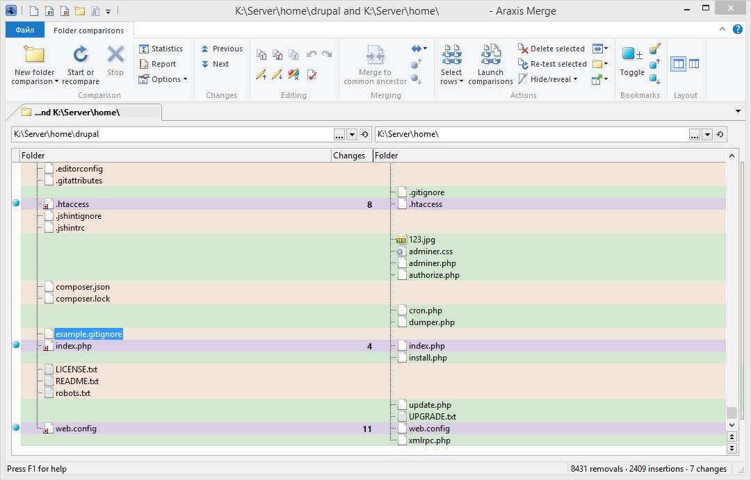 Второй основной режим работы Araxis Merge — сравнение и синхронизация каталогов. Сильная сторона этого инструмента — поддержка различных источников: виртуальная файловая система, сетевые диски, проекты и другие источники. При сравнении, доступны две панели с отображением структуры каталогов, также несложно активировать режим трехстороннего слияния.