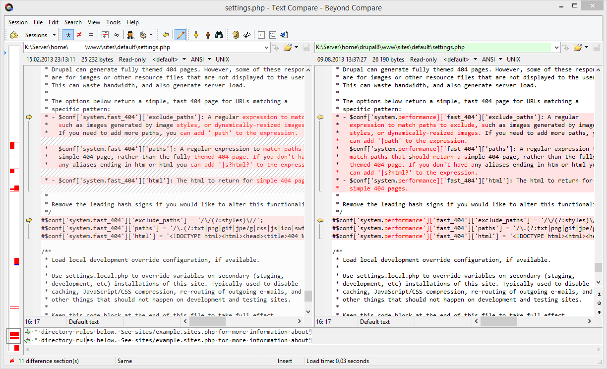 В режиме сравнения файлов используется традиционный двухпанельный интерфейс. Цвет шрифта позволяет отметить важные различия (красная маркировка) и менее существенные (синяя), фоновый цвет также несет функциональное значение. Для правки текста предусмотрен полноценный редактор исходного кода с поддержкой соответствующих форматов (см. Tools → File Formats).