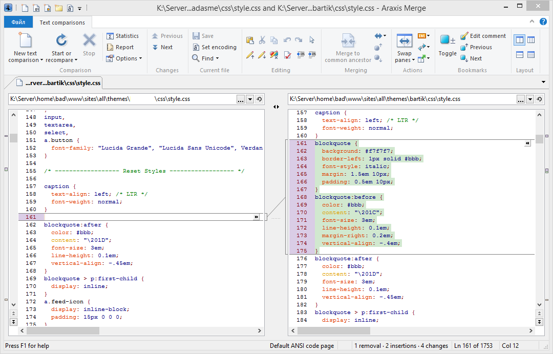 Из других особенностей редактирования: предусмотрена нумерация строк, подсветка синтаксиса (C/C++, Java, C#, Javascript, CSS и мн. др.), в том числе парных скобок. Все внесенные в документах правки маркируются: текст был изменен, удален или добавлен. Результат сравнения можно экспортировать в diff-, txt- или html-файл и, опционально, отправить на email.