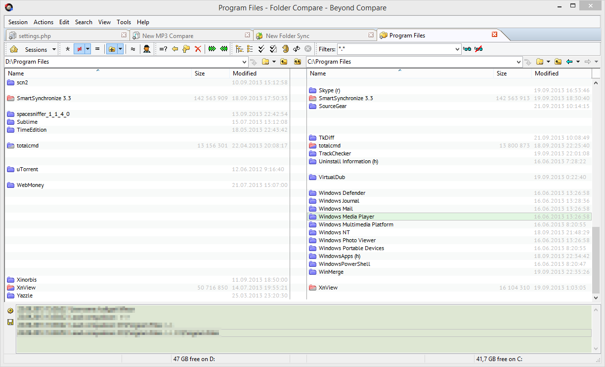 Программа для сравнения файлов и папок, в том числе заархивированных или расположенных на удаленном сервере. С помощью Beyond Compare 3 также можно сравнивать ключи Реестра, изображения, MP3-теги, синхронизировать каталоги, редактировать исходный код и выполнять множество других задач.