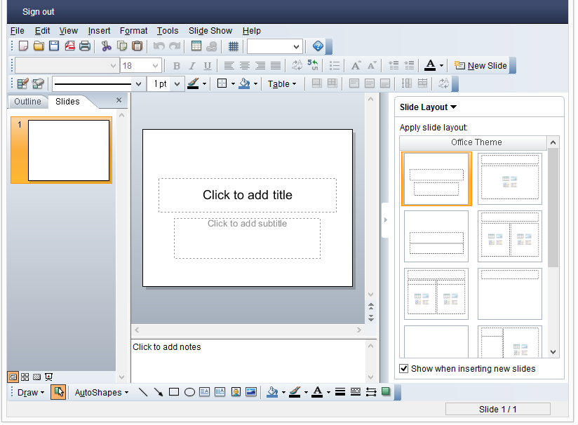 В приложении для работы с презентациями Show имеется практически весь стандартный набор инструментов. Даже сверх того — множество функций, перекочевавших из приложений Write и Calc: от рисования таблиц до проверки орфографии. После создания нового файла можно зайти в меню «Format» и выбрать шаблон и структуру слайда. Дополнительно, кроме выбора шаблона и разметки, в правой боковой панели Task Pane можно выбрать цветовую схему и оформление таблиц. В нижней части слайда легко добавить примечание.