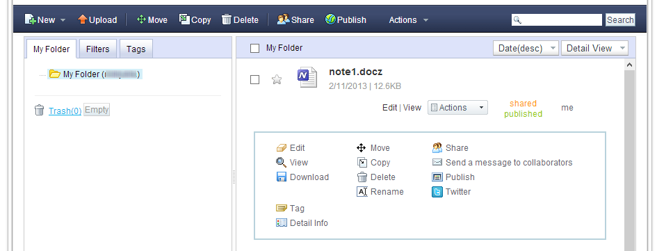 Под хранение документов предоставляется 1 ГБ дискового пространства. Для категоризации можно использовать папки, теги и фильтры. Фильтры — те же папки в Google Docs, разделяющие файлы по владельцу, атрибутам (опубликован документ или нет), отметке (Избранное).