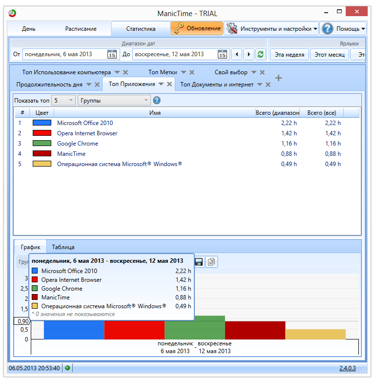 Далее следуют разделы «Приложения», «Документы и интернет», «Топ метки». Топ в каждом из разделов позволяет выяснить, на какие приложения, сайты пришлось больше всего времени, в часах — информация доступна в виде графиков, диаграмм и таблиц. Данные статистики группируются по различным интервалам времени и, в целом, дают очень четкое представление о затраченном времени. Также необходимую информацию легко экспортировать в CSV формат.