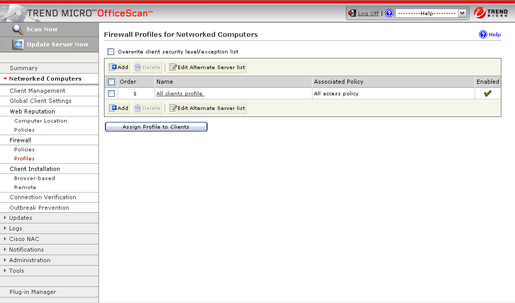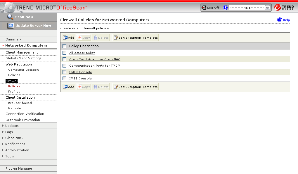 На этой вкладке настраиваются политики ограничения трафика. По умолчанию создано несколько политик, которые необходимы для работы и управления Trend Micro OfficeScan. Администратор может создать любое количество новых политик. Их настройки достаточно гибки для создания политик практически любой сложности.