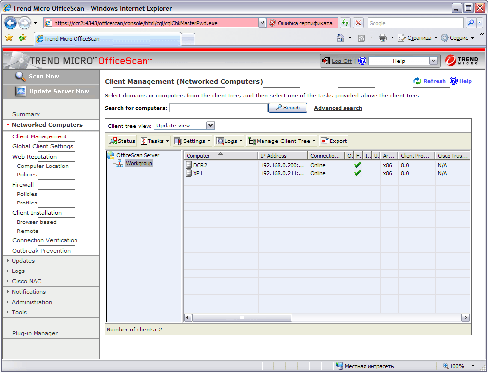 Для установки можно воспользоваться ссылкой, которая сгенерирована на экране авторизации для входа в веб-консоль. Её вид примерно такой: https://server:4343/officescan/console/html/ClientInstall/ Для этого типа установки также необходимо иметь права администратора на компьютере. После установки компонента ActiveX в браузере будет открыта следующая страница: