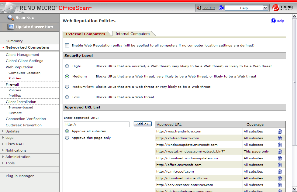 По умолчанию в список разрешённых узлов добавлены сайты, с которых могут быть скачаны обновления Trend Micro OfficeScan и Microsoft Windows. Администратор имеет возможность добавить в этот список любые сайты, причём, добавить сразу полностью весь домен или только определённую страницу. Каждый посещаемый пользователем сайт оценивается по пятибалльной шкале: от низкого уровня угрозы до высокого. Самый высокий уровень защиты блокирует неоценённые сайты, сайты, содержащие веб-угрозы и сайты, которые могут содержать такие угрозы с разной степенью вероятности. Внизу этой вкладки размещён чекбокс «Allow clients to send logs to the OfficeScan server». После его отметки, клиенты начнут периодически присылать на сервер OfficeScan журналы работы фильтра репутации посещаемых сайтов, проанализировав которые, администратор может скорректировать уровень защиты или пополнить список разрешённых сайтов.