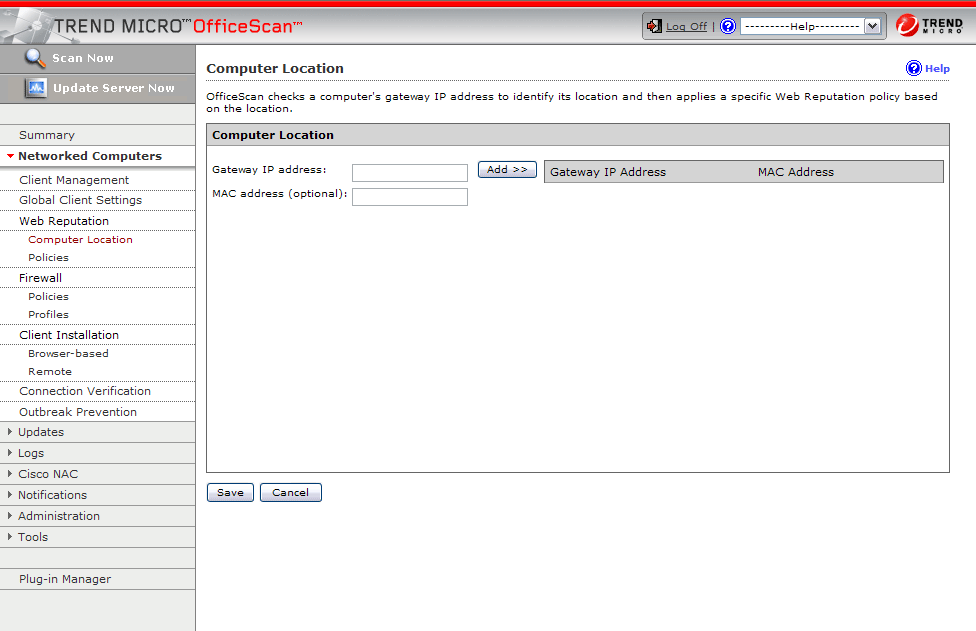 Фильтр может быть применён как к компьютерам, находящимся в локальной сети, так и ко внешним компьютерам. Настройки этих двух зон независимы и разнесены на вкладки «External Computers» и «Internal Computers». Находится ли в данный момент клиентский компьютер в локальной сети или за её пределами, OfficeScan определяет по IP и MAC адресам используемого шлюза, которые должны быть предварительно указаны на вкладке «Computer Location».