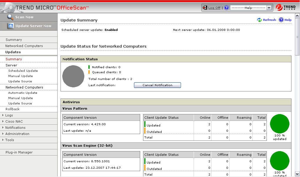 Администратор может настроить автоматическое, по расписанию скачивание обновлений с серверов Trend Micro и выполнить внеочередное обновление вручную. На странице «Update Source» можно указать в качестве источника для получения обновлений сервер Trend Micro или любой другой сервер. Используя второй вариант, администратор может настроить централизованное обновление филиалов компании с одного, своего сервера. Помимо этого, в качестве источника для получения обновлений может быть указан адрес общего ресурса в локальной сети, доступ к которому может быть ограничен паролем.